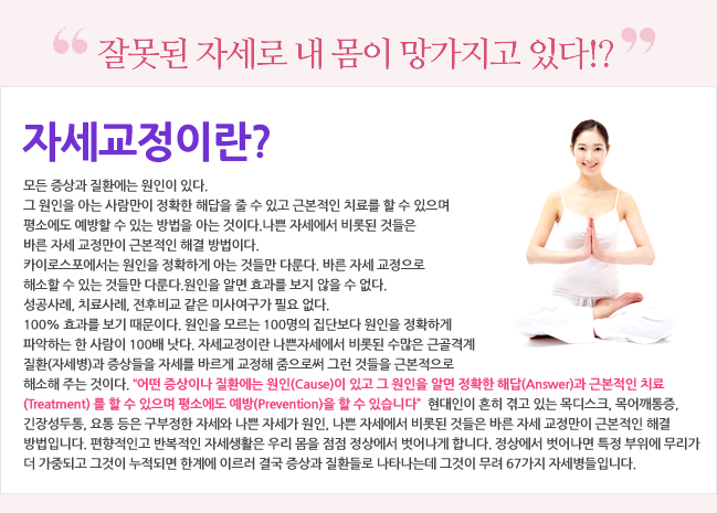 ±×»Ó¸¸ ¾Æ´Ï¶ó ¸ñ°ú ¾î±ú ±ÙÀ°ÀÇ ±äÀå°ú ÅëÁõ, ±äÀ强 µÎÅë, ÆíµÎÅë, ¸¸¼ºÇÇ·Î, ´«ÀÇ ÇÇ·Î, ÁýÁß·Â ÀúÇÏ, ¹«±â·ÂÁõ, ¸Ö¹Ì Áõ»ó, ¸¸¼º ¼ÒÈ ºÒ·®, ÆÈ/¾î±ú °á¸², °ßºñÅë, ¿äÅë, ôÃßÃø¸¸Áõ, ô¼öÈĸ¸Áõ, ôÃßÀü¸¸Áõ, ÀÚ¼¼ºÒ±ÕÇü, È£Èí °ï¶õ, Á¤·Â °¨Åð µîÀ» ¾Î°í ÀÖ´Â °æ¿ì¶ó¸é ³ª»Û ÀÚ¼¼¿¡ ±× ¿øÀÎÀÌ ÀÖÀ» ¼ö ÀÖÀ¸¹Ç·Î ÀÚ¼¼±³Á¤ Ä¡·á¸¦ ¹Þ´Â °ÍÀÌ È¿°úÀûÀÌ´Ù.